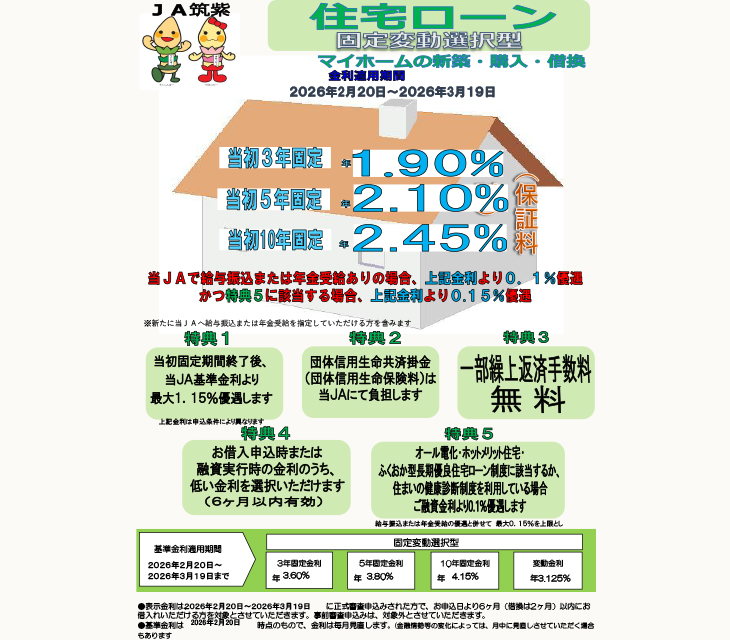 オール電化、ホットメリット住宅、ふくおか型長期優良住宅ローン制度に該当するか、住まいの健康診断制度を利用された場合および給与振込もしくは年金受給を当JAにご指定いただける方はさらに0.127%引き下げいたします。